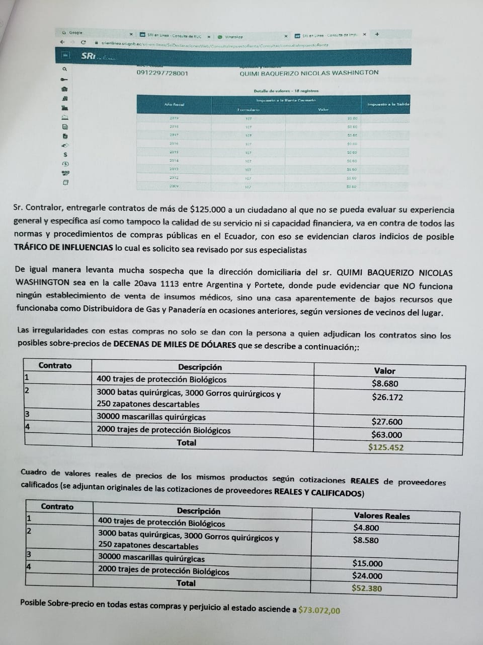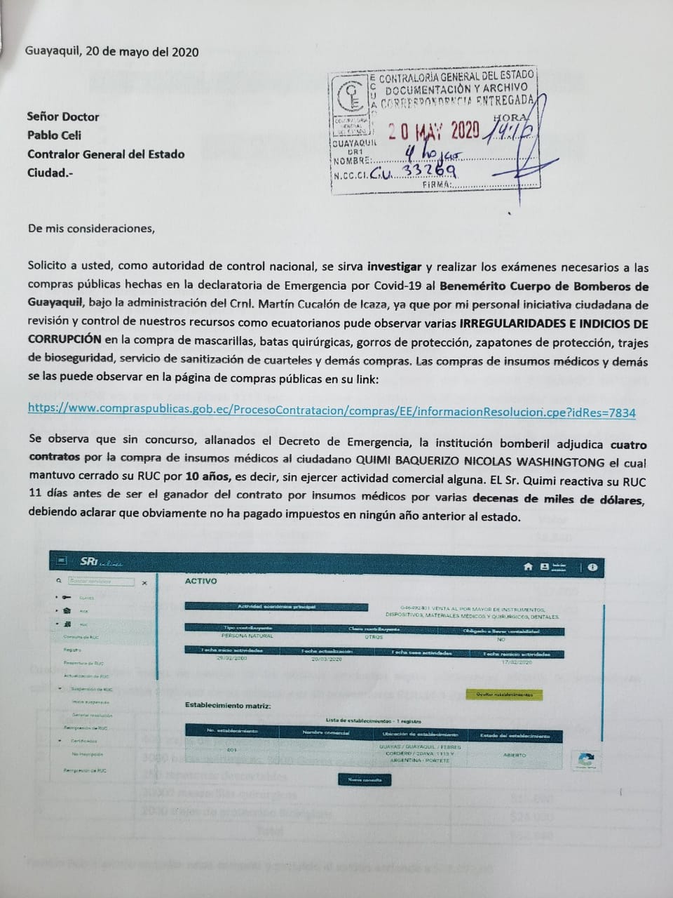 En la denuncia presentada en la Contraloría General detalla, como una prueba adicional de las presuntas irregularidades, que el proveedor Nicolás Quimí Baquerizo mantuvo cerrado su RUC durante 10 años, sin tener actividad alguna, pero lo reactiva apenas 11 días de hacerse con los contratos del Cuerpo de Bomberos de Guayaquil.